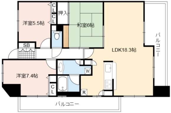 | 間取り詳細 | LDK 18.3畳 、 洋室 7.4畳 、 和室 6畳 、 洋室 5.5畳 |