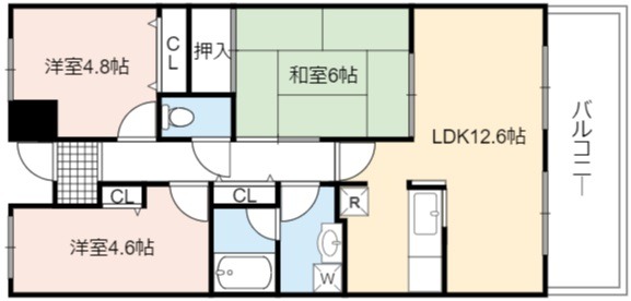 | 間取り詳細 | LDK 12.6畳 、 和室 6畳 、 洋室 4.8畳 、 洋室 4.6畳 |
