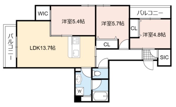 | 間取り詳細 | LDK 13.7畳 、 洋室 5.7畳 、 洋室 5.4畳 、 洋室 4.8畳 |