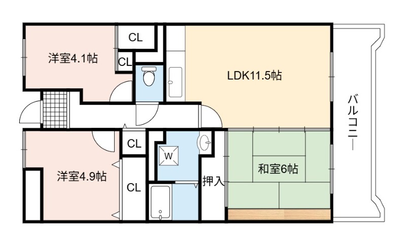 | 間取り詳細 | LDK 11.5畳 、 和室 6畳 、 洋室 4.9畳 、 洋室 4.1畳 |