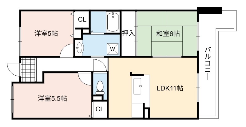 | 間取り詳細 | LDK 11畳 、 和室 6畳 、 洋室 5.5畳 、 洋室 5畳 |