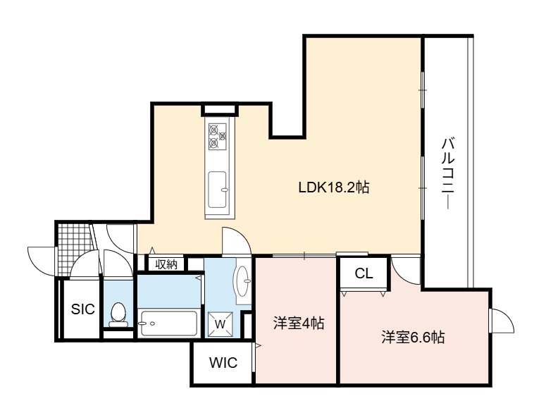 間取り詳細 | LDK 18.2畳 、 洋室 6.6畳 、 洋室 4畳 |