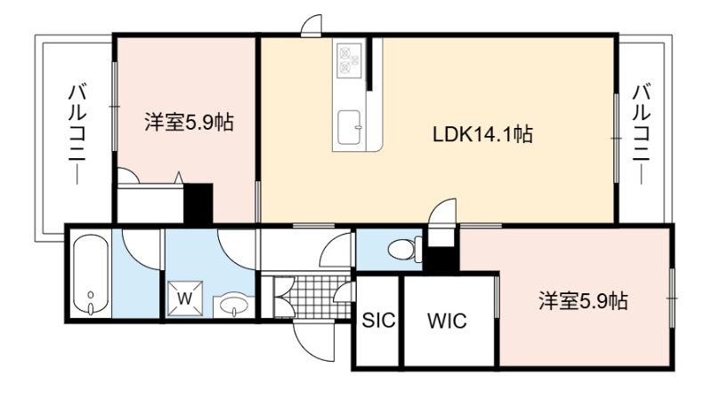 | 間取り詳細 | LDK 14.1畳 、 洋室 5.9畳 、 洋室 5.9畳 |
