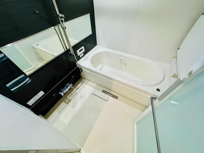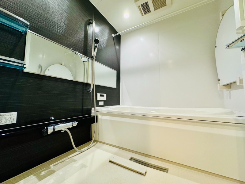 駐車場のある角部屋、防犯カメラ・オートロック付きで安心、追焚きや浴室乾燥機、温水洗浄便座、シャンプードレッサーのある住まい。