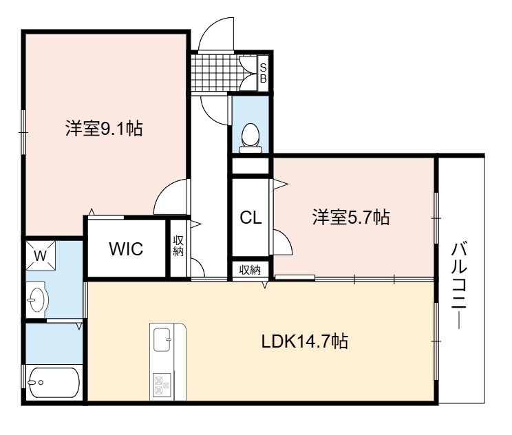 | 間取り詳細 | LDK 14.7畳 、 洋室 9.1畳 、 洋室 5.7畳 |