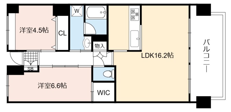 | 間取り詳細 | LDK 16.2畳 、 洋室 6.6畳 、 洋室 4.5畳 |