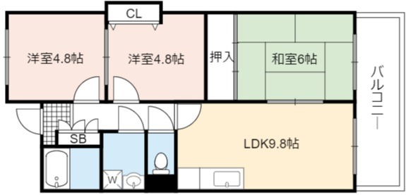 | 間取り詳細 | LDK 9.8畳 、 和室 6畳 、 洋室 4.8畳 、 洋室 4.8畳 |