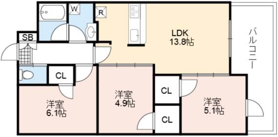 | 間取り詳細 | LDK 13.8畳 、 洋室 6.1畳 、 洋室 5.1畳 、 洋室 4.9畳 |