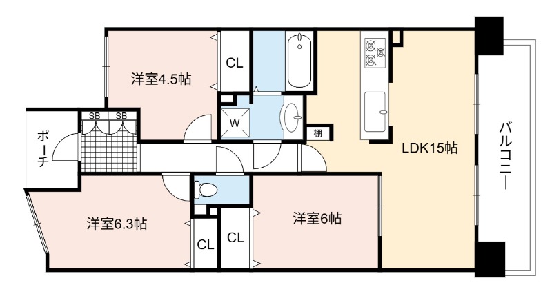 | 間取り詳細 | LDK 15.2畳 、 洋室 6.3畳 、 洋室 6畳 、 洋室 4.5畳 |
