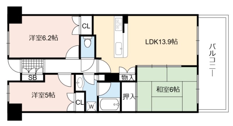 | 間取り詳細 | LDK 13.9畳 、 洋室 6.2畳 、 和室 6畳 、 洋室 5畳 |