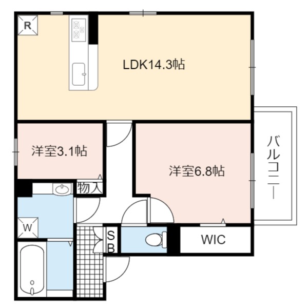 | 間取り詳細 | LDK 14.3畳 、 洋室 6.8畳 、 洋室 3.1畳 |