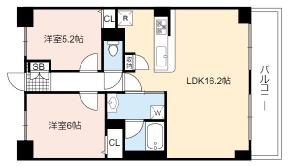 | 間取り詳細 | LDK 16.2畳 、 洋室 6.2畳 、 洋室 5.2畳 |