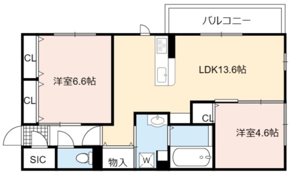 | 間取り詳細 | LDK 13.6畳 、 洋室 6.6畳 、 洋室 4.6畳 |