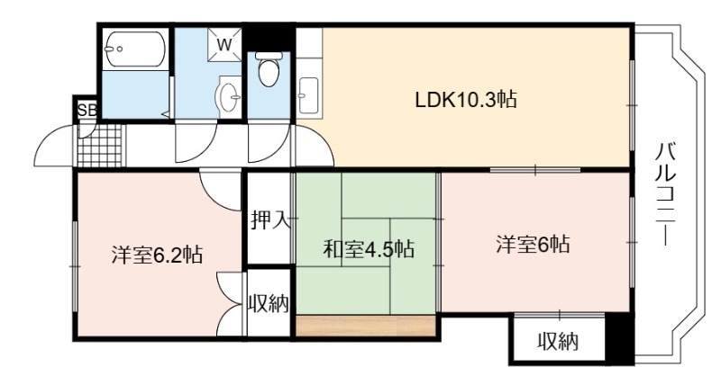 | 間取り詳細 | LDK 10.3畳 、 洋室 6.2畳 、 洋室 6畳 、 和室 4.5畳 |