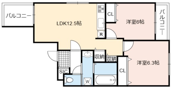 | 間取り詳細 | LDK 12.5畳 、 洋室 6.3畳 、 洋室 6畳 |