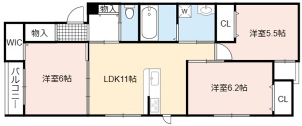 | 間取り詳細 | LDK 11畳 、 洋室 6.2畳 、 洋室 6畳 、 洋室 5.5畳 |