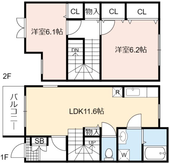 | 間取り詳細 | LDK 11.6畳 、 洋室 6.2畳 、 洋室 6.1畳 |