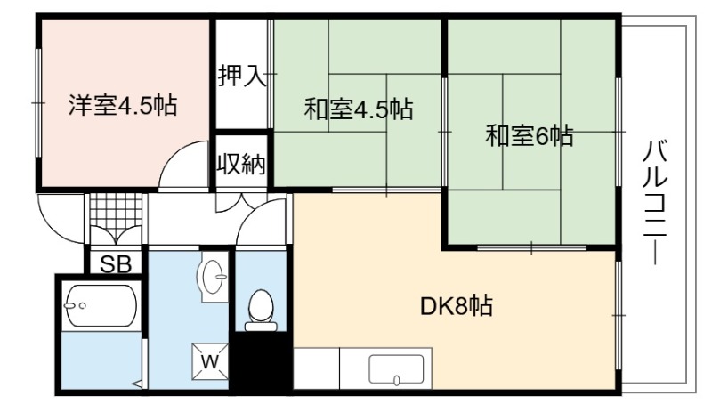 | 間取り詳細 | DK 8畳 、 和室 6畳 、 洋室 4.5畳 、 和室 4.5畳 |