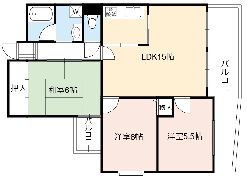| 間取り詳細 | LDK 15畳 、 洋室 6畳 、 和室 6畳 、 洋室 5.5畳 |