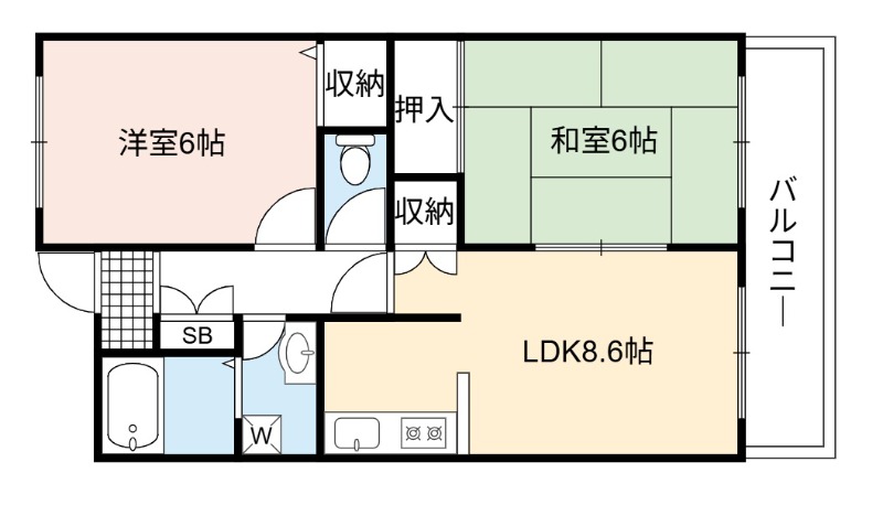 | 間取り詳細 | LDK 8.6畳 、 洋室 6畳 、 和室 6畳 |