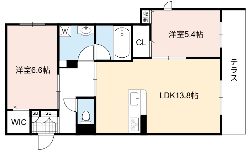 | 間取り詳細 | LDK 13.8畳 、 洋室 6.6畳 、 洋室 5.4畳 |