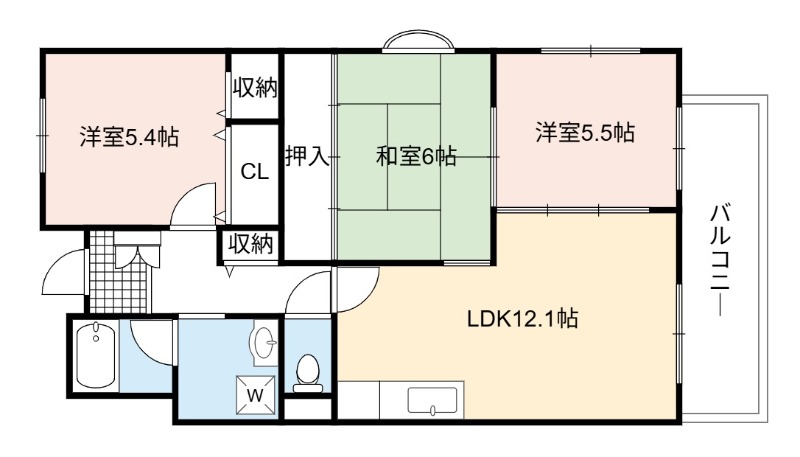 | 間取り詳細 | LDK 12.1畳 、 和室 6畳 、 洋室 5.5畳 、 洋室 5.4畳 |